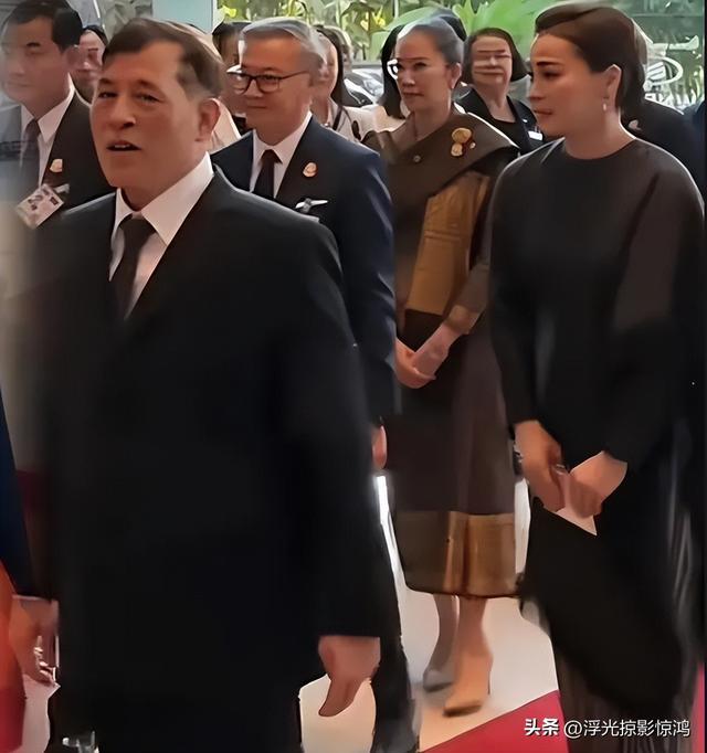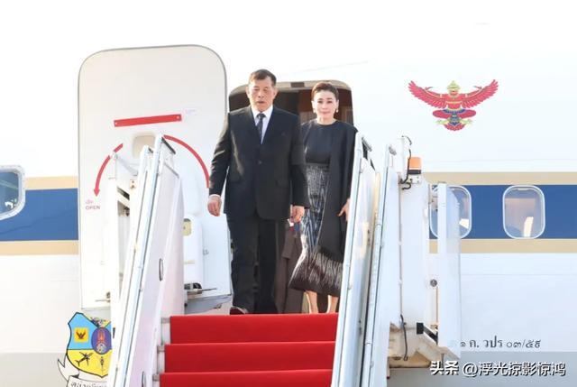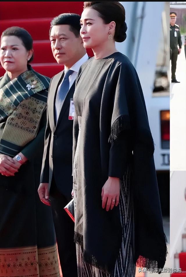 国王先一步走下飞机舷梯,然后苏提达在三步之后牢牢追跟着丈夫玛哈国王。泰王是玄色西服搭配深色领带,而苏提达王后则是聚会了老挝传统特质服装,以玄色长披肩搭配银线裹身裙,惊艳亮相。