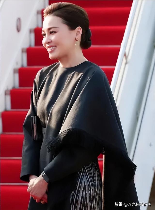 因为众所重知的原因,泰国王室这1年仍旧处于为王太后诗丽吉服丧技巧,因此泰王老婆的服装也依旧是玄色系的素服装。