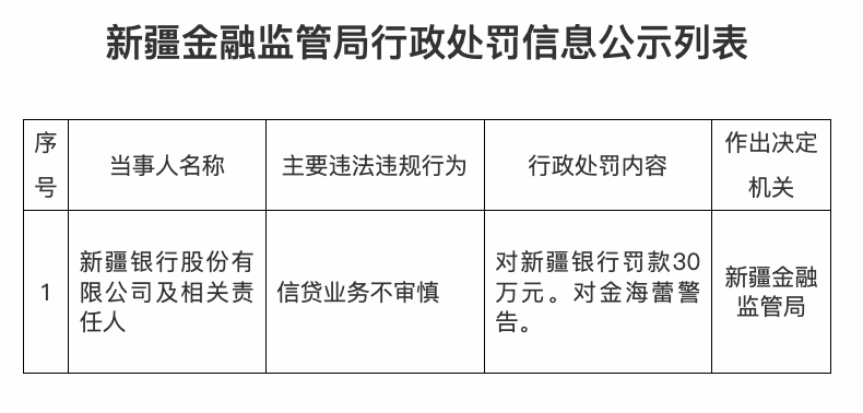 网财经讯 4月13日,据国度金融监督措置总局官网音问,新疆银行因信贷业务不审慎被罚金30万元,有关背负东说念主金海蕾受到警告。